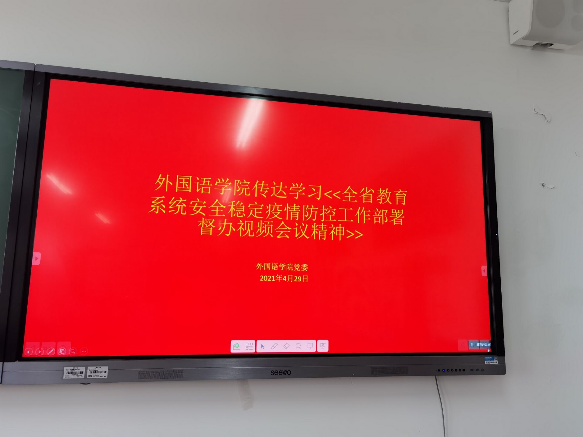 2022年4月29日,公司组织全院教职工,及时传达学习29日上午召开的全省教育系统安全稳定疫情防控工作部署督办视频会议精神。